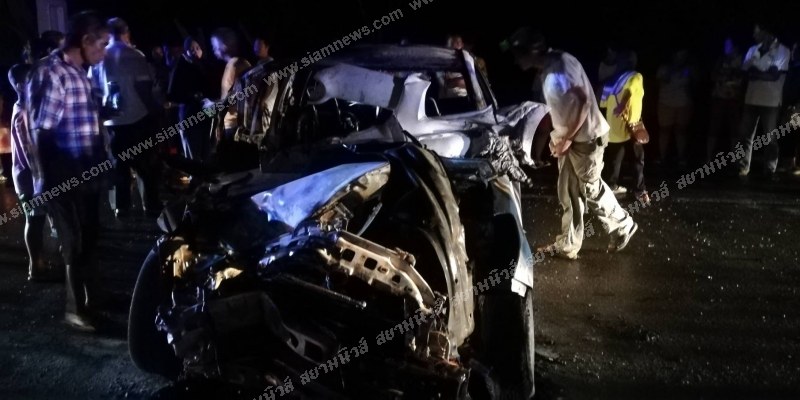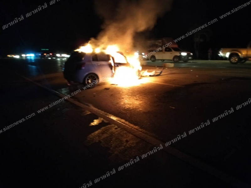 หญิงท้อง 7 เดือน ขับเก๋งชนท้ายกระบะ ไฟลุกท่วม ทัวร์สวนทางชนซ้ำตกข้างทาง ดับ 1 เจ็บอีก 12