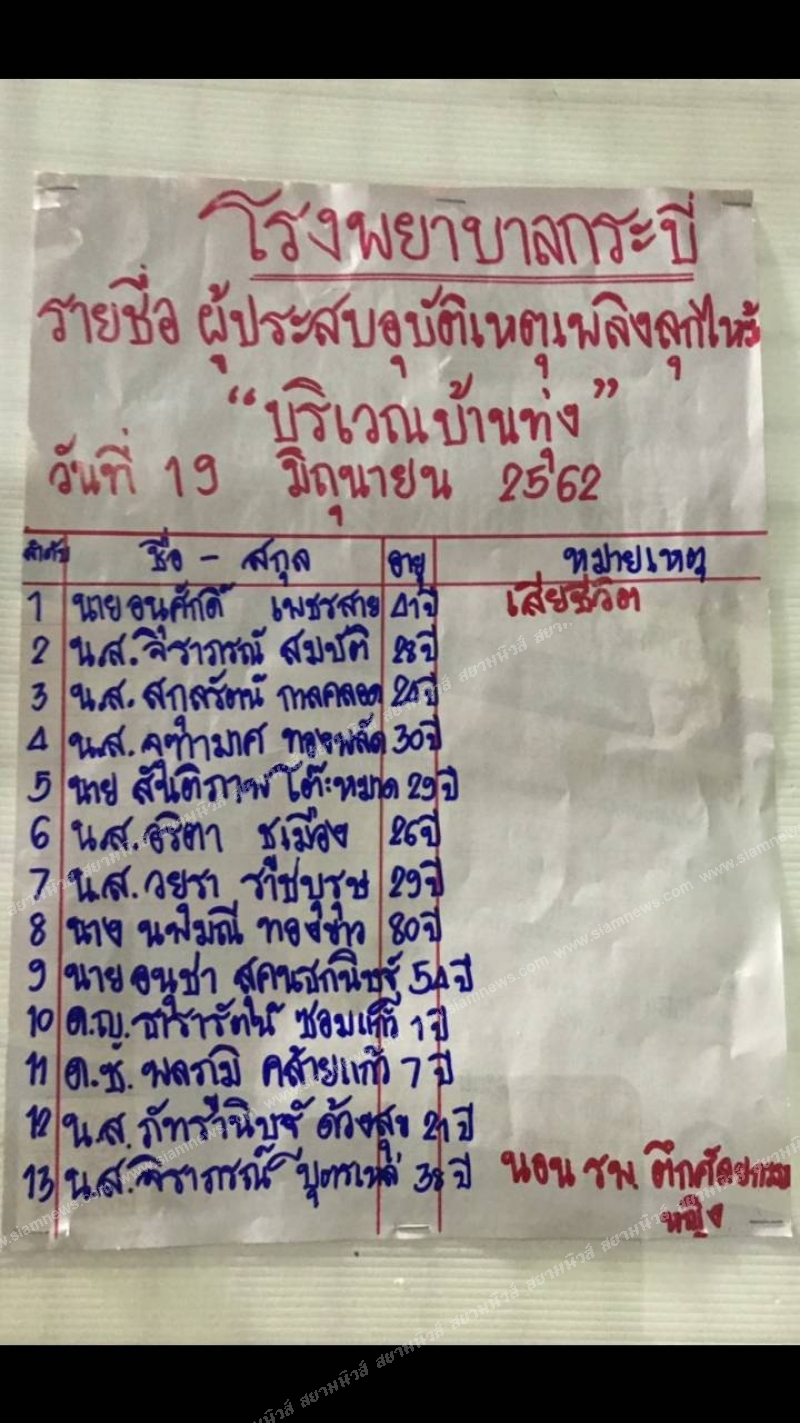 เมื่อเวลา 20.00 น.วันที่ 19 มิ.ย.62 ร.ต.อ.ศราวุธ กิตติเรืองระยับ รอง สว.สอบสวน สภ.อ่าวนาง อ.เมือง จ.กระบี่ รับแจ้งเกิดอุบัติเหตุรชนกัน หลายคัน และมีผู้บาดเจ็บหลานราย เหตุเกิดที่บริเวณถนนเพชรเกษม ก่อนถึงด่านชั่งน้ำหนัก ประมาณ 1 กม.ม.1 ต.เขาคราม อ.เมืองกระบี่ จึงรายงานให้ผู้บังคับบัญชาทราบรุดไปตรวจสอบพร้อมด้วย เจ้าหน้าที่ตำรวจป้อมยาม ต.เขาคราม ขนส่งจังหวัดกระบี่ ทางหลวงกระบี่ เจ้าหน้าที่จากมูลนิธิกระบี่พิทักษ์ประชา และมูลนิธิประชาสันติสุขกระบี่ ร่วมตรวจสอบ