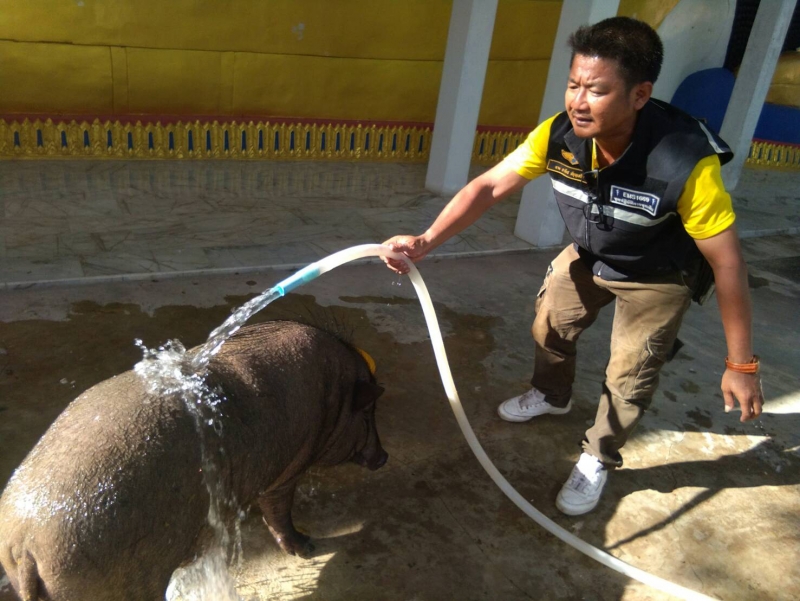 เจ้าหน้าที่จึงอาบน้ำทำความสะอาดล้างบาดแผล และฉีดยาฆ่าเชื้อและยาแก้ปวด เพื่อป้องกันไม่ให้เกิดการอักเสบก่อนแจ้งเจ้าหน้าที่ตำรวจ สภ.เดิมบางนางบวช มาตรวจสอบเพื่อสืบสวนหาตัวคนร้ายที่เข้ามาก่อเหตุ พระอธิการเช้ากมฺมสุทฺโธ เจ้าอาวาสวัดเขาใหญ่ กล่าว่าวัดแห่งนี้อยู่บนเขา และมีพื้นที่โดยรอบเป็นป่าไม้ดังนั้นเมื่อประมาณ 10 กว่าปีก่อนทางวัดได้เลี้ยงหมูป่าไว้ให้อยู่กับธรรมชาติ ครั้งแรกมีไม่กี่ตัวต่อมาได้ออกลูกออกหลานทำให้ปัจจุบันนี้มีหมูป่าทั้งหมดกว่า 20 ตัว