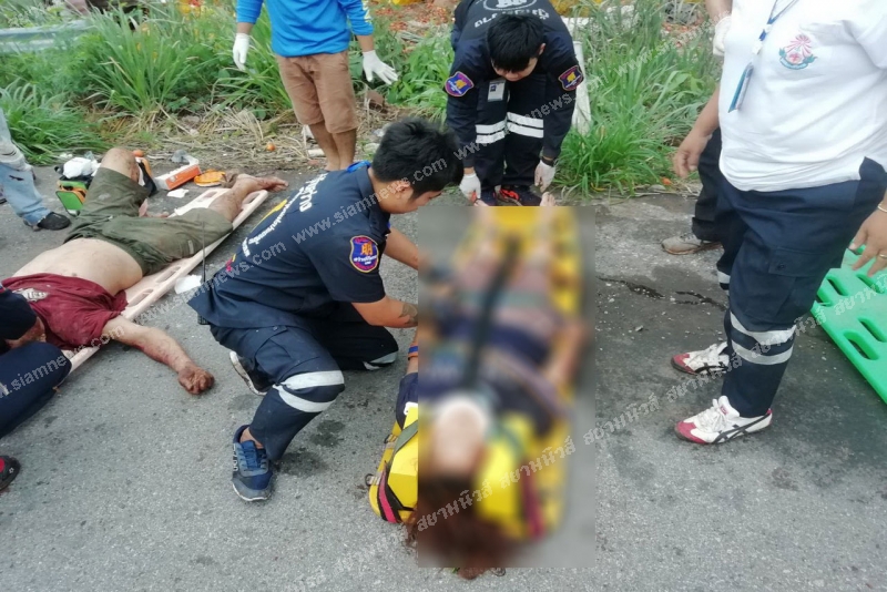 พบรถบรรทุกหกล้อฮีโน่ สีขาว ทะเบียน 70-2411 หนองคาย สภาพชนกับราวเหล็กกั้นริมทางจนพลิกคว่ำหงายท้องสภาพรถพังยับเยิน มะเขือเทศเทกระจายไปทั่วบริเวณ พบผู้บาดเจ็บสองรายอาการสาหัสถูกอัดก็อปปี้ภายในรถ กู้ภัยฯ รีบช่วยเหลือออกมาจากรถชื่อนายเอกชัย แก้วศิริ อายุ 59 ปี อยู่บ้านเลขที่ 178 หมู่ 6 อ.ปากชม จ.เลย (คนขับ) และนางบุญเชื่อม บุญสุภา อายุ 47 ปี อยู่บ้านเลขที่ 122 หมู่ 6 อ.ปากชม จ.เลย รับนำส่ง รพ.วังสะพุง