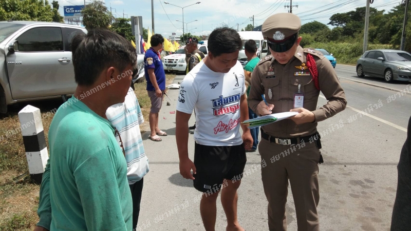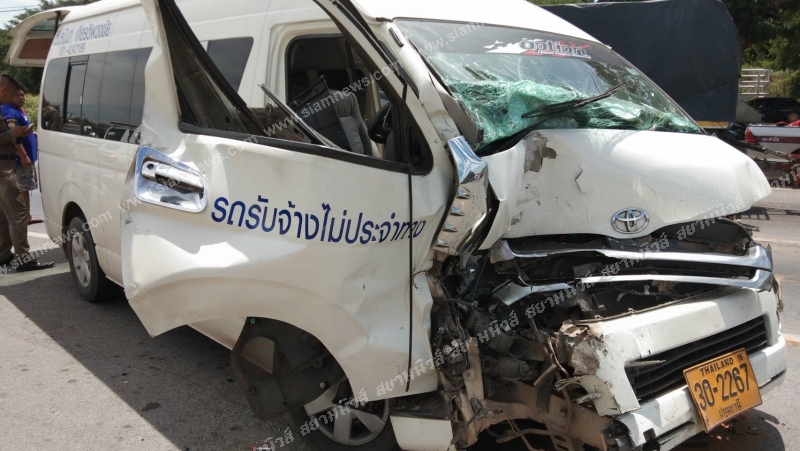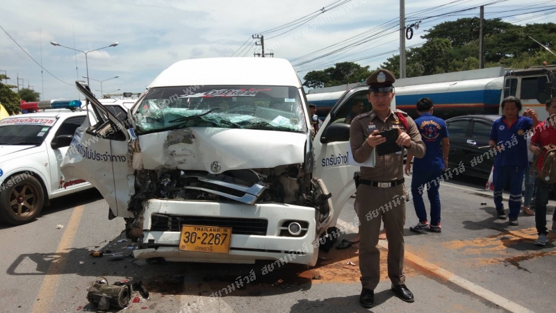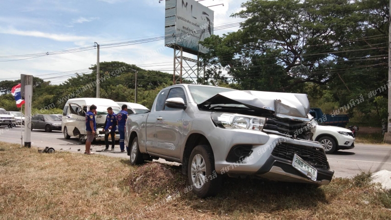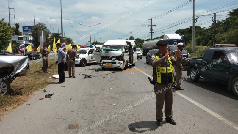 โดยภายในรถตู้รับจ้างไม่ประจำทางป้ายเหลือง สภาพด้านหน้าพังยับ หมายเลขทะเบียน 30-2267 ปทุมธานี มีผู้ได้รับบาดเจ็บ จำนวน 15 ราย ร่วมคนขับ ซึ่งบาดเจ็บสาหัสติดภายใน เจ้าหน้าที่มูลนิธิจึงใข้เครื่องตัดถ่างรุดให้ความช่วยเหลือ และรีบนำส่งโรงพยาบาล ห่างไปเล็กน้อยยังพบรถยนต์กะบะยี่ห้อ โต้โยต้า รีโว่ สีบรอนเงิน หมายเลขทะเบียน 2 ฒธ-5513 กรุงเทพมหานคร. กระเด็นอยู่บนเกาะกลางสภาพด้านหน้า ด้านหลังพังยับเข่นเดียวกัน และมีผู้บาดเจ็บ 2 ราย ส่วนรถยนต์กะบะนิสสันนาวาร่า สีทอง และ รถยนต์เก๋งยี่ห้อ โตโยต้าวีออส สีดำ ไม่มีผู้ได้รับบาดเจ็บ สภาพรถทั้ง 2 คันด้านท้ายถูกชนจนยุบได้รับความเสียหาย ส่วนผู้ได้รับบาดเจ็บทั้งหมด เจ้าหน้าที่มูลนิธิขุนรัตนาวุธนำส่งโรงพยาบาลมะการักษ์ ทราบชื่อผู้บาดเจ็บทั้งหมดรวม 17 ราย คือ 1.นายวรเชษฐ์ โพธิ์ษาจันทร์ อายุ47 ปี อยู่บ้านเลขที่ 1/54 ถนนสามวาซอย1 แขวงมีนบุรี เขตมีนบุรี กรุงเทพมหานคร (คนขับรถตู้)อาการสาหัส ขาหักทั้งสองข้าง บาดเจ็บตามร่างกาย 2.นางสาวประทิน จิตต์ใจฉ่ำ อายุ48 ปี อยู่บ้านเลขที่. 246/100 หมู่ที่ 5 ต.สนามชัย อ.เมือง จว.นครปฐม บาดเจ็บตามร่างกาย จุกและเจ็บหน้าอก 3.นายอำนาจ อ่วมสา อายุ 50 ปี 4.นายPhanvilai Maniln อายุ 25 ปี(สัญชาติลาว)บาดเจ็บสาหัสศรีษะฉีกขาด ส่วนผู้บาดเจ็บที่เหลือบาดเจ็บเล็กน้อยถลอกตามร่างกาย และจุกแน่นหน้าอก ทั้งหมดสัญชาติลาว